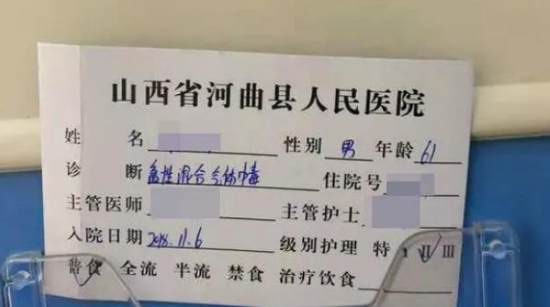 周青峰(化名)在河曲縣人民醫院就診,就診卡顯示其為急性混合氣體中毒。